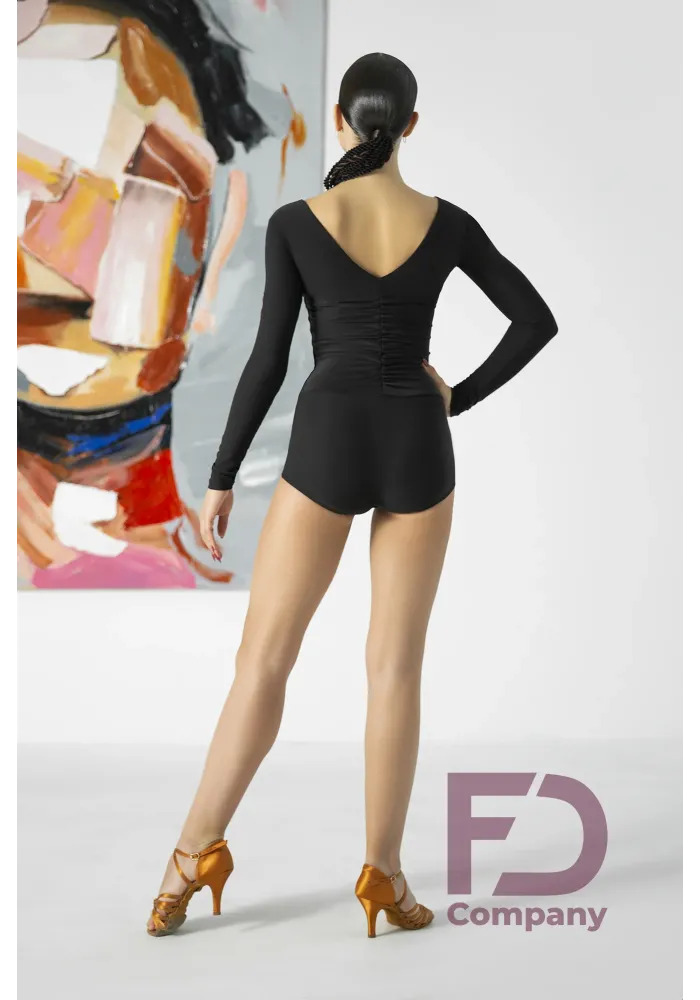 Dance Leotard has long sleeves and a deep V-neck on the front and back. Vertical drapery on the front and back. The bodice is double, the panties are stitched with a fastener with buttons at the bottom. The product is made ...